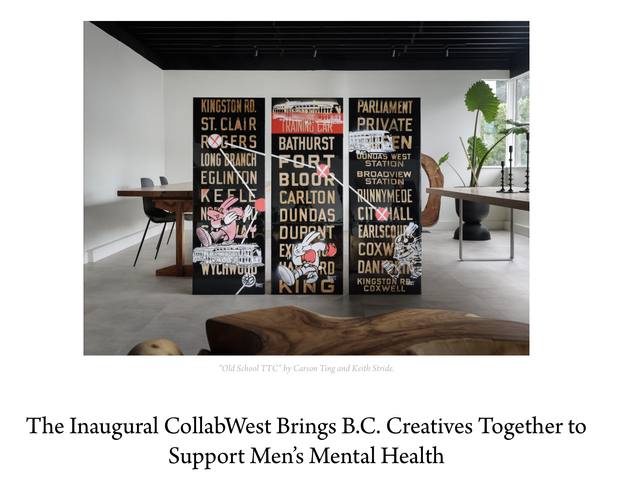 This year’s collaborators—Keith Stride, Chairman Ting, and The Team behind Reduxwood West join forces to create three unique pieces presented in an exclusive silent auction with 100% of proceeds going to HeadsUpGuys, a program of the University of British Columbia and the global leader in men’s mental health support.